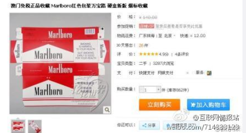 像之前在淘寶、京東上也有很多店鋪打著煙標(biāo)收藏的幌子,銷售卷煙制品,不過所銷售的卷煙是真是假就不得而知了。隨著近年來相關(guān)部分監(jiān)督力量的加強(qiáng),淘寶上也對違規(guī)銷售煙草制品的店鋪進(jìn)行了處理,現(xiàn)在很少能找的到了。以上就是香煙網(wǎng)小編為大家整理介紹的關(guān)于網(wǎng)上買香煙去哪個(gè)網(wǎng)站針對介紹的網(wǎng)上買煙的正規(guī)網(wǎng)站相關(guān)信息,更多了解點(diǎn)擊:2018年香煙網(wǎng)購商城郵寄新規(guī)定:每人最多可買2條