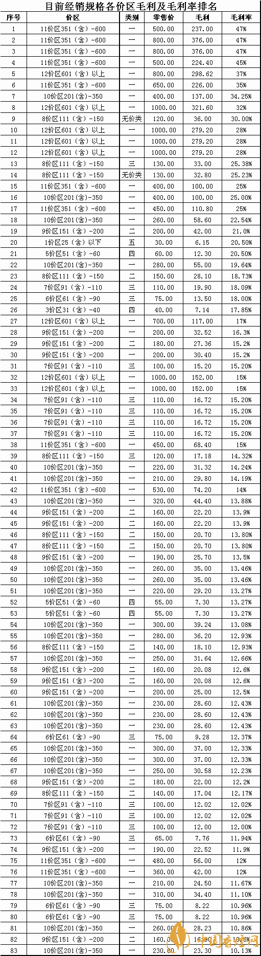 注:從目前全市經(jīng)銷的83個(gè)品牌批零差價(jià)可以看出,單品牌規(guī)格毛利率低于11%的僅有5個(gè)規(guī)格且全部高于10%的毛利率,部分溢價(jià)的規(guī)格產(chǎn)品毛利率已經(jīng)接近了50%,卷煙規(guī)格的平均毛利率達(dá)到了17.97%,然而這都預(yù)期的毛利,為什么真實(shí)的現(xiàn)狀是我們賺不到這應(yīng)該屬于我們自己的毛利率和毛利,是值得每一個(gè)卷煙經(jīng)營(yíng)者深思和考慮的問題?為了保障大家的合法利益我們隱藏了商品名稱和商品編碼,有經(jīng)驗(yàn)的零售客戶對(duì)照價(jià)區(qū)和商品獲利水平就可以清晰的對(duì)商品進(jìn)行定位,具體對(duì)應(yīng)商品規(guī)格請(qǐng)參照2019版《卷煙零售客戶服務(wù)手冊(cè)》卷煙價(jià)格一覽表有詳解。