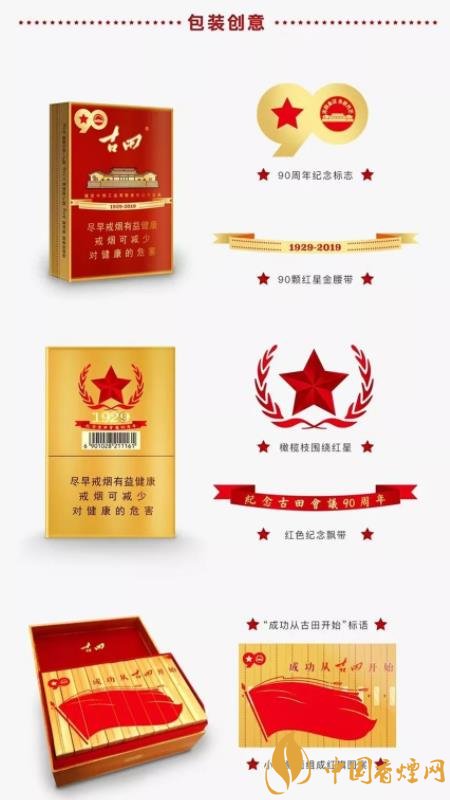 古田金中支90周年紀(jì)念版在包裝正面左上角有90周年紀(jì)念標(biāo)志,在煙包腰部位置有90顆紅星組成的金腰帶;在包裝背面有以橄欖枝圍繞的紅星和紅色紀(jì)念飄帶;打開煙包可以看見清晰的“成功從古田開始”的標(biāo)語和小盒側(cè)面組成的紅旗圖案。種種設(shè)計,巧具匠心,輝映歷史。此時正值歲末年初元旦之際,古田金中支90周年紀(jì)念版是紅色卷煙中不可多得的禮贈、過節(jié)佳選。