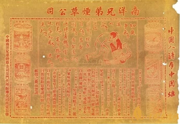 18世紀(jì)90年代初,由愛國華僑簡照南、簡玉階兄弟二人創(chuàng)辦的南洋兄弟煙草公司推出一枚“大中華”煙標(biāo),抗擊英美“洋煙”;