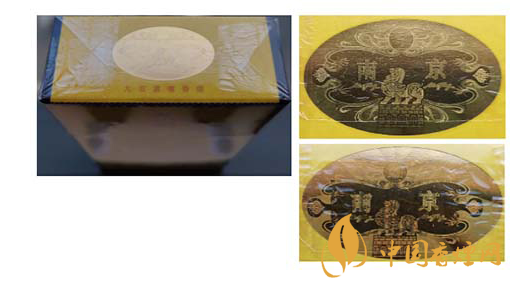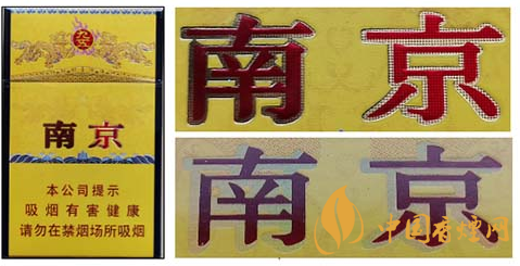 真品卷煙:南京字體邊緣金色輪廓線和筆畫(huà)由小圓點(diǎn)組成,側(cè)光觀察感覺(jué)為網(wǎng)格狀痕跡。