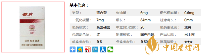 | 類型 :混合型 | 焦油量 :6mg | 煙氣煙堿量 :0.6mg | 一氧化碳量 :7mg |