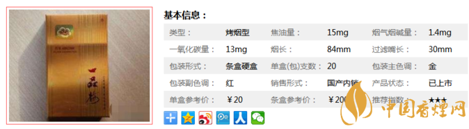 | 類型 :烤煙型 | 焦油量 :15mg | 煙氣煙堿量 :1.4mg | 一氧化碳量 :13mg |
