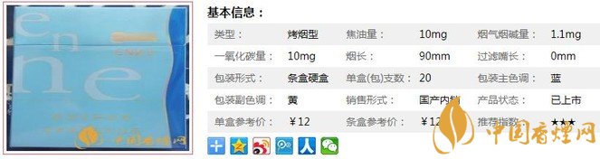 | 類型 :烤煙型 | 焦油量 :10mg | 煙氣煙堿量 :1.1mg | 一氧化碳量 :10mg |