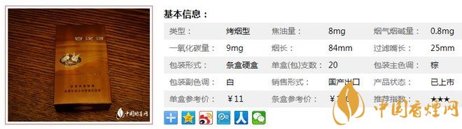 | 類型 :烤煙型 | 焦油量 :8mg | 煙氣煙堿量 :0.8mg | 一氧化碳量 :9mg |