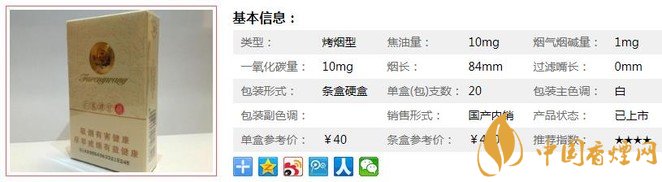 | 類型 :烤煙型 | 焦油量 :10mg | 煙氣煙堿量 :1mg | 一氧化碳量 :10mg |