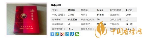 | 類型 :烤煙型 | 焦油量 :12mg | 煙氣煙堿量 :1.1mg | 一氧化碳量 :13mg |