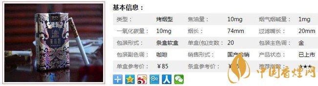 | 類型 :烤煙型 | 焦油量 :10mg | 煙氣煙堿量 :1mg | 一氧化碳量 :10mg |