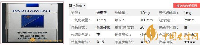 百樂門藍(lán)煙支長100mm,過濾嘴:22mm,濾嘴前端銀色的圓環(huán)圍繞著Silver Blue的銀色字樣;藍(lán)色的PARLIAMENT;上面是百樂門箭型的Logo。非常喜歡的煙支Logo設(shè)計(jì),簡潔而漂亮!下面我們一起來看百樂門藍(lán)的參數(shù)信息:焦油量:12mg 煙堿量:1mg 一氧化碳量:13mg