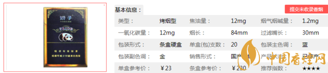 嬌子國(guó)寶藍(lán)天嬌煙支長(zhǎng)84mm,過(guò)濾嘴30mm,全面應(yīng)用具有自主知識(shí)產(chǎn)權(quán)、獲五項(xiàng)國(guó)家發(fā)明專利的復(fù)合生物制劑,以卟啉融合多種天然植物提取活性成分,可有效降低卷煙煙氣中四類(lèi)十余種有害成分,是嬌子專利減害與配方技術(shù)完美結(jié)合的體現(xiàn)。下面我們一起來(lái)看嬌子國(guó)寶藍(lán)天嬌的參數(shù)信息:焦油量:12mg 煙堿量:1.2mg 一氧化碳量:12mg