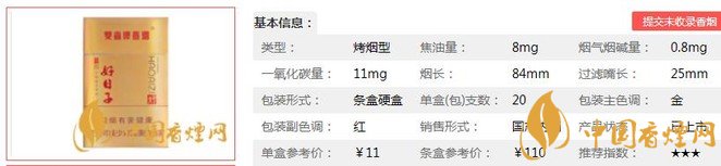 | 類型 :烤煙型 | 焦油量 :8mg | 煙氣煙堿量 :8mg | 一氧化碳量 :11mg |