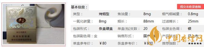 | 類型 :烤煙型 | 焦油量 :8mg | 煙氣煙堿量 :0.8mg | 一氧化碳量 :8mg |