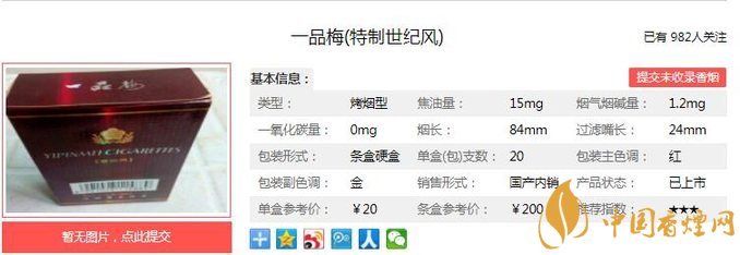 品梅世紀風(fēng)煙氣甜韻圓潤、柔綿舒適、入喉清新豐滿、順暢、醇綿、飽滿、輕靈,此煙還是很不錯的,口感著實純正飽滿,醇厚干凈。經(jīng)香煙網(wǎng)小編市場調(diào)查一品梅世紀風(fēng)售價為20元/包。