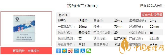 以自主煙葉基地優(yōu)質(zhì)煙葉為基礎(chǔ),優(yōu)選津巴布韋,巴西等優(yōu)質(zhì)煙葉,充分運(yùn)用小葉組配方技術(shù),使產(chǎn)品煙香純正,口感舒適,香氣醇和飽滿,煙氣細(xì)膩柔順,口感舒適,余味干凈,安全環(huán)保。經(jīng)香煙網(wǎng)小編市場調(diào)查鉆石玉蘭70mm售價為13元/包。