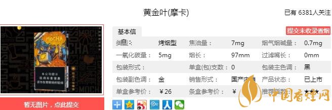 黃金葉摩卡煙支長(zhǎng)97mm,煙嘴設(shè)計(jì)為暗金色,甜甜的有點(diǎn)像煊赫門,煙支拿在手上十分舒適。下面我們一起來(lái)看黃金葉摩卡的參數(shù)信息:焦油量:7mg 煙堿量:0.7mg 一氧化碳量:5mg