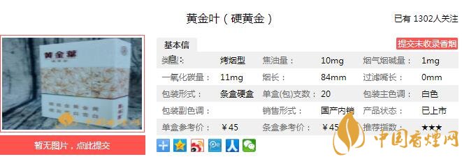 內(nèi)在設(shè)計(jì)延續(xù)黃金葉濃香品類技術(shù)特色,突出 “醇香”風(fēng)格,秉承“平衡與協(xié)調(diào)”設(shè)計(jì)理念,通過產(chǎn)品葉組配方設(shè)計(jì)、加香加料設(shè)計(jì)和卷煙材料的配套設(shè)計(jì),注重保持產(chǎn)品香氣、濃度的同時(shí),提高口感的舒適度和煙氣的輕松感。香氣醇和優(yōu)雅,煙氣凈甜舒爽,突出自然流暢,輕松愉悅。經(jīng)香煙網(wǎng)小編市場(chǎng)調(diào)查黃金葉硬黃金售價(jià)為45元/包。