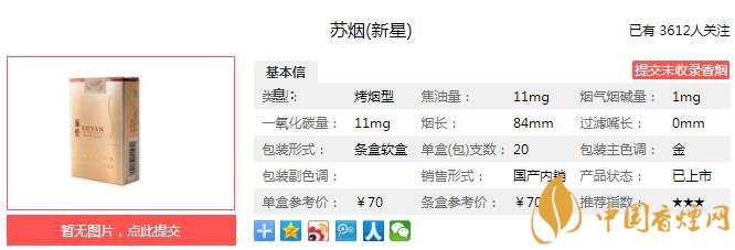 蘇煙(新星)和蘇煙(天星)是“蘇煙”全新推出的“星系列”的兩個(gè)原創(chuàng)型產(chǎn)品;這兩款“星系列”的主力規(guī)格共同承載“蘇煙”通過主銷價(jià)區(qū)向上延伸力爭實(shí)現(xiàn)提升品牌價(jià)值的戰(zhàn)略意義,并以此來鞏固和提升“蘇煙”在高端消費(fèi)者心目中所具有的“高端身份”的價(jià)值認(rèn)知。經(jīng)香煙網(wǎng)小編市場調(diào)查蘇煙新星售價(jià)為70元/包。