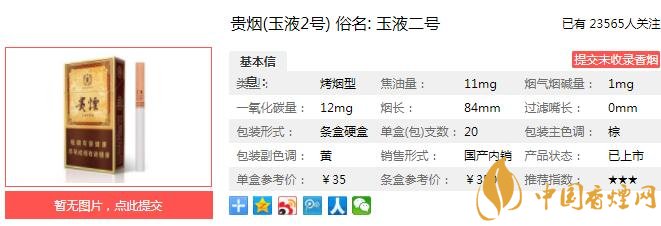 貴煙(玉液2號)科學(xué)運用酒中豐富自然香氣成分,通過與天然、原生態(tài)的煙草本香互相配伍,形成豐富、多層次的復(fù)合香韻,實現(xiàn)煙香與酒味的共同融合,成卷煙產(chǎn)品保潤增香、口感獨特、回味舒適的特點。經(jīng)香煙網(wǎng)小編市場調(diào)查貴煙(玉液2號)售價為35元/包。