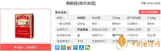 黃鶴樓(南洋叁號)整個煙盒比較復(fù)古,后面經(jīng)典的人物商標(biāo),作為一個煙民就算不看煙的名字看到后面的封面也知道這一定是黃鶴樓了,側(cè)面是煙的數(shù)值,焦油11可算是中規(guī)中矩了。下面便是黃鶴樓(南洋叁號)的基本參數(shù):焦油量:11mg 煙堿量:1.1mg 一氧化碳量:13mg.