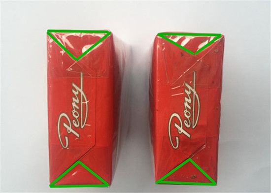 牡丹香煙(軟)真假鑒別圖中可以發(fā)現(xiàn)真煙底部折痕形狀規(guī)則,為對(duì)稱的等腰三角形;而假煙的底部三角形折痕形狀不規(guī)則,而且不對(duì)稱。