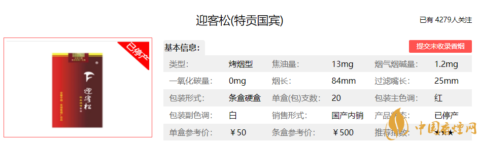 選用享譽(yù)中外的優(yōu)質(zhì)煙葉作為配方主體,產(chǎn)品香氣濃郁,煙氣厚實(shí)自然,口感舒適干凈。產(chǎn)品自然醇化,秉承迎客松產(chǎn)品一貫的優(yōu)良品質(zhì),精心配制,獨(dú)具香韻。即保持了迎客松優(yōu)美的清香風(fēng)格,又賦予成熟煙草的焦甜芬芳,香氣韻味豐富,渾然一體,著重體現(xiàn)優(yōu)雅細(xì)膩、醇和自然、清新宜人的特點(diǎn),口感舒適,回味甘甜,勁頭適中。經(jīng)香煙網(wǎng)小編市場(chǎng)調(diào)查迎客松特貢國(guó)賓售價(jià)為50元/包。