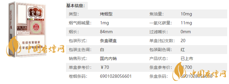 | 類型 :烤煙型 | 焦油量 :10mg | 煙氣煙堿量 :1mg | 一氧化碳量 :11mg |