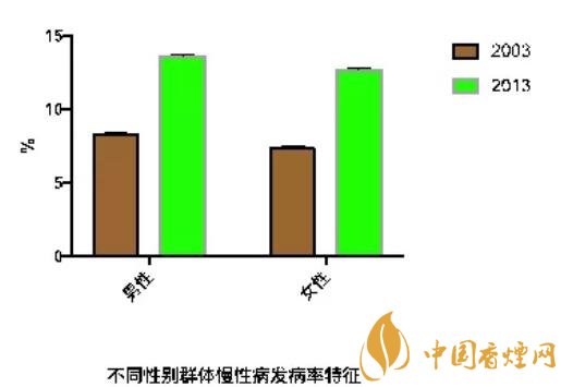 進(jìn)一步,作者對(duì)吸煙相關(guān)的慢性病發(fā)病情況進(jìn)行了分析,結(jié)果顯示:從2003年到2013年,女性群體慢性病的發(fā)病率從8.3%上升到了13.6%。男性群體發(fā)病率則從7.3%上升到了12.7%。其中,吸煙群體的發(fā)病率顯著高于不吸煙的群體。而吸煙開始時(shí)間越早,則發(fā)病率越高。支氣管癌、肺癌以及牙病的發(fā)病率在吸煙群體中比例較高。而類風(fēng)濕性關(guān)節(jié)炎與心臟病的發(fā)生率則較低。長期來看,吸煙引發(fā)的最主要的疾病為消化系統(tǒng)癌癥、慢性阻塞性肺病(COPD)以及腦血管疾病。