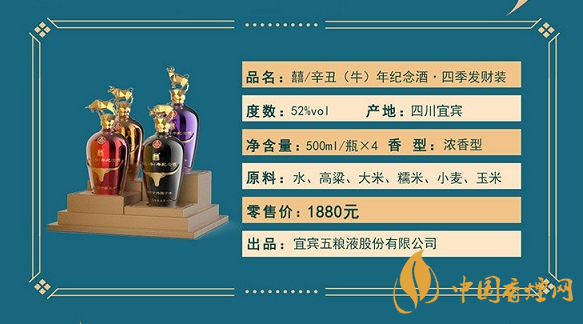 五糧液辛丑(牛)年紀(jì)念酒.四季發(fā)財裝,瓶蓋 頂立如牛,切割金屬牛以金屬材質(zhì)潛心鑄造四種靈敏聚財?shù)慕鹋P螒B(tài)!瓶身 金牛頭,采用浮雕工藝,將牛年傳統(tǒng)生肖結(jié)合,鴻運當(dāng)頭照,宜賓五糧液有限公司:囍酒!瓶底 電鍍工藝質(zhì)感,細致浮雕防滑!五糧液辛丑(牛)年紀(jì)念酒.四季發(fā)財裝京東售價1880元。
