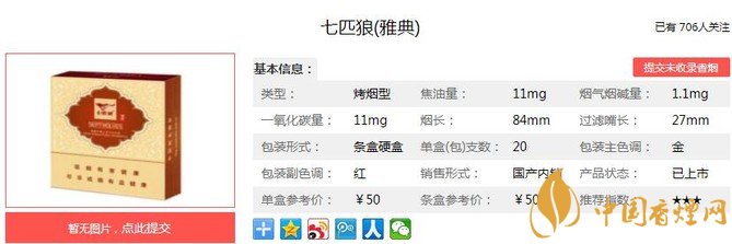 七匹狼雅典煙支長84mm,過濾嘴長27mm,嗅香是淡淡的煙草清香,輕捏煙支飽滿有彈性,可見填充較為嚴實,煙葉色澤油亮,梗絲碎葉極少,品質不錯。下面我們一起來看七匹狼雅典的參數(shù)信息:焦油量:11mg 煙堿量:1.1mg 一氧化碳量:11mg