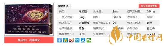 | 類型 :烤煙型 | 焦油量 :9mg | 煙氣煙堿量 :0.9mg | 一氧化碳量 :8mg |