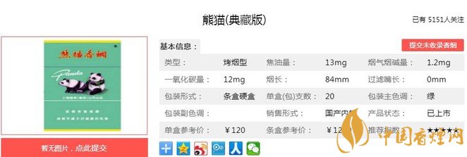 熊貓(典藏版)煙支長(zhǎng)84mm,過(guò)濾嘴長(zhǎng)30mm,金色“熊貓”、藍(lán)色“Panda”的字樣印在橫紋卷煙紙上,導(dǎo)致煙條段的視覺(jué)效果很短。煙絲為純?nèi)~絲,無(wú)填料,金黃油潤(rùn),柔軟整齊,品質(zhì)上乘。下面我們一起來(lái)看熊貓(典藏版)的參數(shù)信息:焦油量:13mg 煙堿量:1.2mg 一氧化碳量:12mg