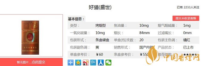 好貓盛世以高香低危害為主要設計方向,主要原料精心選用自然醇化兩年以上的云南、津巴布韋煙葉,突出產(chǎn)品優(yōu)雅的清香,煙香豐富諧調(diào)。在香料配方中首次采用具有生物減害技術的中草藥“豐和液”,使有害氣體得以轉(zhuǎn)移降解,達到了“生津不起痰,回甜不口干”的良好效果。經(jīng)香煙網(wǎng)小編市場調(diào)查好貓盛世售價為60元/包。