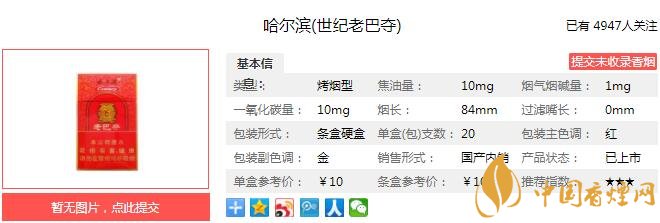 哈爾濱老巴奪煙支長(zhǎng)84mm,過濾嘴長(zhǎng)25mm,使用從植物中提取的天然香原料和天然植物保潤技術(shù),保證卷煙舒適感;以清甜香風(fēng)格為基礎(chǔ),采用創(chuàng)新性中支(7.0mm)規(guī)格,在保證滿足感前提下,注重?zé)熛愕拇己透?、舒適感和甜潤感,同時(shí)兼顧卷煙安全性。下面我們一起來看哈爾濱老巴奪的參數(shù)信息:焦油量:10mg 煙堿量:1.0mg 一氧化碳量:10mg