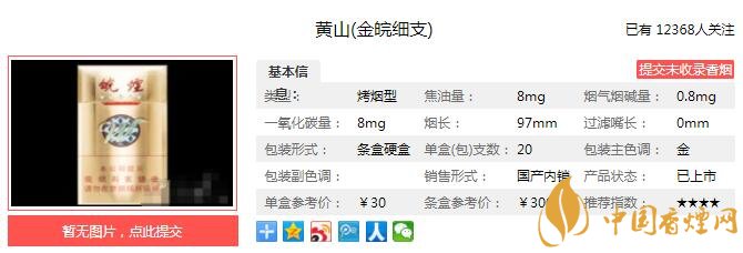 黃山金皖細(xì)支精選皖南煙區(qū)上等“焦甜香”煙葉,深度醇化發(fā)酵,創(chuàng)新提香工藝,精心調(diào)配,認(rèn)真打造每一支卷煙。外形亮麗、內(nèi)有乾坤,添加石斛爆珠,提供不一樣的消費(fèi)體驗(yàn)。經(jīng)香煙網(wǎng)小編市場(chǎng)調(diào)查黃山金皖細(xì)支售價(jià)為30元/包。