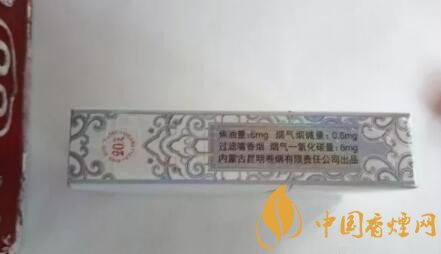 煙盒的左側(cè)是理化指標(biāo),寫(xiě)在一種銀色的花紋勾勒的邊框內(nèi),焦油量:6mg,煙氣煙堿量:0.6mg,煙氣一氧化碳量:8mg和內(nèi)蒙古昆明出品等字樣。