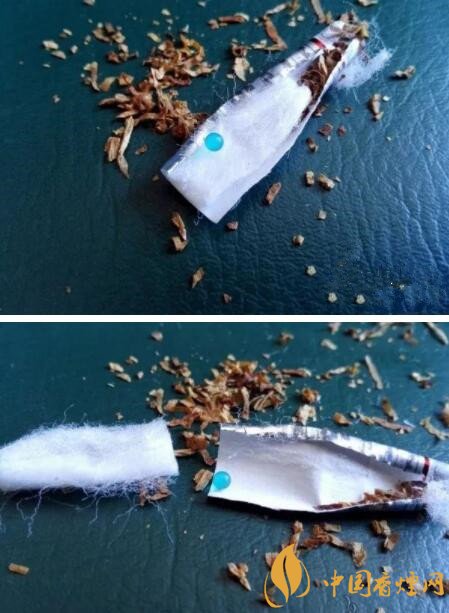 下面兩張圖片,是過(guò)濾嘴中內(nèi)置爆珠剪開(kāi)后的構(gòu)造。爆珠的顏色為藍(lán)色,里面的海綿是一段完整未分離的樣式。