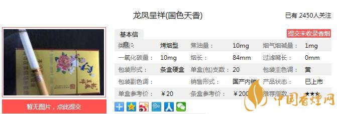嗅聞煙支,散發(fā)出來的帶有些濃郁且微呈酸香的氣味。這種酸香氣味,并非陳年老煙所釋放出來的氣味。再明白點說,就是在煙草原香基礎(chǔ)上,似乎又人工調(diào)入了一些香氣。經(jīng)香煙網(wǎng)小編市場調(diào)查龍鳳呈祥國色天香售價為20元/包。