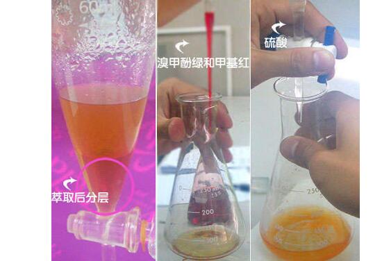 4,以三氯甲烷為萃取劑,為指示劑,用標準硫酸溶液直接滴定尼古丁的方法(操作及顏色變化見圖4)。