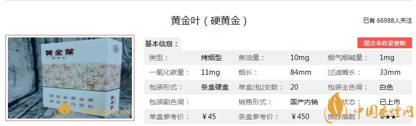 黃金葉硬黃金煙支長84mm,過濾嘴長33mm,煙支的設計很漂亮,淡粉紅色的葉形狀加上金色的承托,更顯出此煙的與眾不同,握在手里的感覺也十分舒適。下面我們一起來看黃金葉硬黃金的參數(shù)信息:焦油量:10mg 煙堿量:1.0mg 一氧化碳量:11mg。