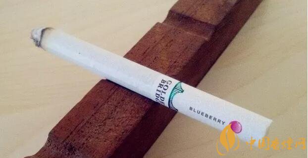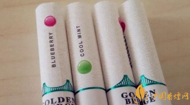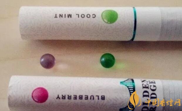 國產(chǎn)爆珠香煙金橋煙支上一道綠箍,一座綠色的金門大橋坐落其上,暗示了這包煙即使不爆珠也自帶的涼味。水松紙上有爆珠示意圖,靠唇端是紫紅色的藍(lán)莓,靠煙絲端是翠綠色的薄荷。又要用圓點(diǎn)顯示爆珠位置,又要用英文字母標(biāo)注爆珠口味,如果同處一側(cè)將顯得擁擠,因此二者分居濾嘴兩側(cè)錯(cuò)開。煙支上沒有漢字,GOLDEN BRIDGE、BLUEBERRY和COOL MINT,營造出了外煙的既視感。