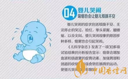 《兒科學雜志》發(fā)表了一項30多項試驗結果的分析報告顯示:煙草會增加血液和腸道里的促胃動素,加強胃8部和腸道的收縮,加強食物在腸胃的運動,使嬰兒哭鬧的概率增加。