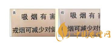 真煙警示語印刷字的邊緣干凈,商標紙底色色原點為點狀微小顆粒,印刷細膩,如警示語第一個“吸”字的最后一筆捺,起筆點是平頭狀;假煙警示語印刷字的邊緣有均勻的鋸齒狀虛邊,商標紙底色色原點為不規(guī)則的點,顆粒大,印刷不均勻且粗糙,如警示語第一個“吸”字的最后一筆捺,起筆點是尖頭狀。
