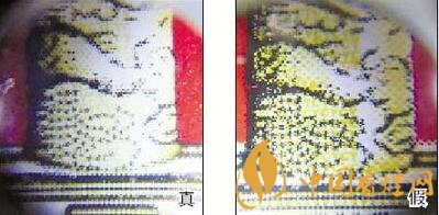真煙天安門左側(cè)華表套色均勻,黃白色分布有明顯分界點,邊緣光滑、干凈、清晰;假煙套色較差,黃白色不明顯,黃色部分印刷較分散,字體邊緣套印有毛渣點,呈現(xiàn)鋸齒狀。