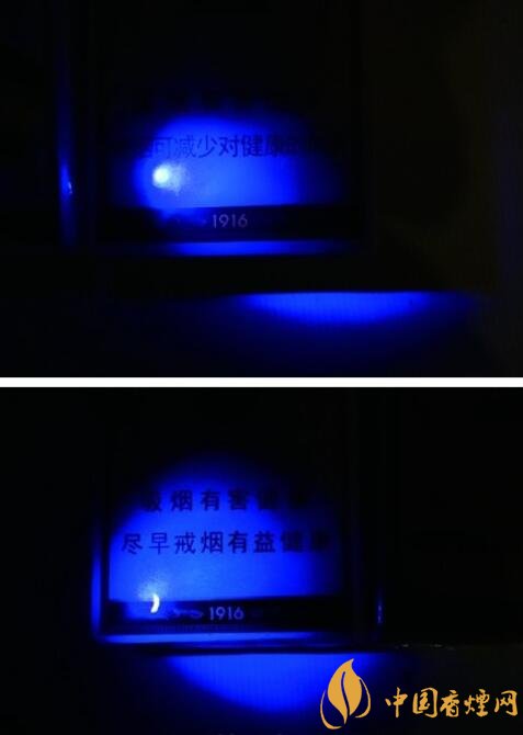 真品小盒正反面“1916”字樣均采用DNA防偽涂層油墨,用紫外熒光燈照射“1916”字樣時,字體由白色變色,“HUANGHELOU”燙金油墨厚且顏色呈現(xiàn)深黃色;假煙仿制材料無法達(dá)到真品材料特殊效果,在同樣的紫外熒光燈照射下沒有任何變化,“HUANGHELOU”仿印油墨涂層較薄,呈現(xiàn)出淺黃色,與真品材質(zhì)存在顯著差異。