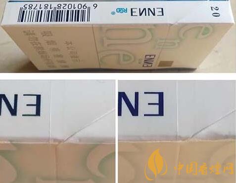 (4)真品卷煙“enne”小寫字母筆畫立體感強。該款假冒卷煙小寫字母筆畫無立體感。