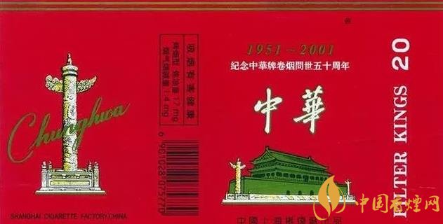1.二十一世紀(jì):2001年,為紀(jì)念中華牌卷煙問世五十周年,金色的“1951-2001”年號(hào)非常顯眼,特制(20支全開式硬卡)這也是全開式中華首次問世。