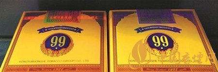 左真右假 真煙中間的“99”圖案,整體偏藍(lán)色,色彩過渡自然,呈現(xiàn)中心淺外圍深漸變效果。假煙中間的“99”圖案,色彩無明顯過渡效果,整體偏黑色,套印也不準(zhǔn)。