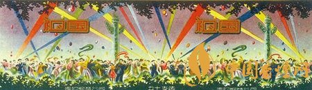 而貴陽(yáng)煙草公司出品于上世紀(jì)50年代的“祖國(guó)”煙標(biāo)(圖4),主版采用明快色調(diào),描繪出了新中國(guó)成立后人民當(dāng)家作主的喜悅之情:只見各族人民身著節(jié)日盛裝,在彩球飄飄、五顏六色的射燈光柱直射天空背景襯托下,聚集于天安門前的華表周圍,在撼天動(dòng)地的鼓樂聲中載歌載舞,盡情地歡慶新中國(guó)的誕生。