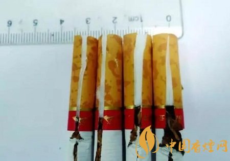 假煙濾嘴棒長(zhǎng)度小于2.5cm,不撕破接裝紙判斷時(shí),用手輕捏濾棒長(zhǎng)度只到接裝紙金線圈處,與真品煙濾嘴棒長(zhǎng)度差異明顯。(左兩支真 右兩支假)