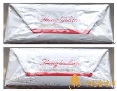 假冒卷煙:1.透明紙燙封收縮雜亂、死板,水汽較重。2.商標(biāo)紙拐角折疊緊實(shí),無(wú)空隙。(上真下假)